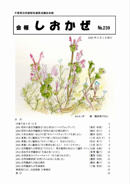 | 2025/6/1 (PDF) | ・口笛を吹くと出てくるよ ・学校支援ボランティアの現場から ・ウツギでも科は色々 | 藤田 隆 (松戸市) 望月力智 (茂原市) 坂本文雄 (佐倉市) |