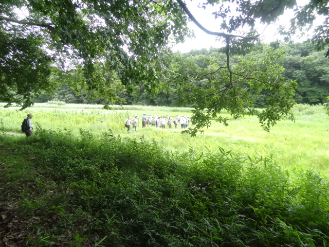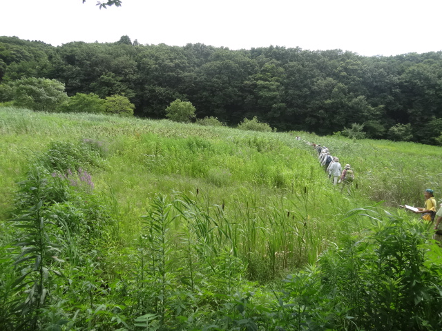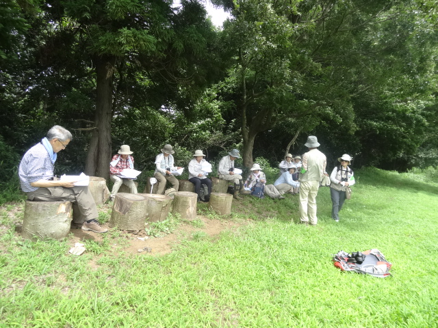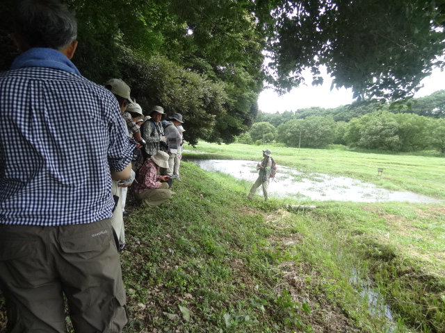 | 台風11号の影響を心配しましたが、雨の心配もなく蒸し暑い日となりました。畔田谷津に着くと、ウスバキトンボが群れ飛び、出迎えてくれました。当地は、佐倉西部自然公園の計画地で、里山・谷津の緑が広がる広大な地域です。しかし、過剰管理によりアズマネザサを刈りすぎてウグイスが減って、ここに生きる生物の環境を奪ってしまう結果となってしまった。…保全の難しさを感じました。 講師より予定などの説明後に、観察会に出発。 | |