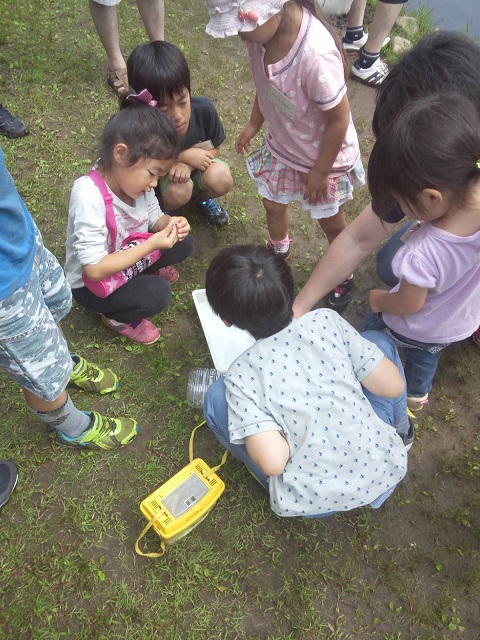 "![]() 03 こんな生き物を見つけたよ。わたしにも見せて、見せて。興味津々にのぞき込んでいます。 |