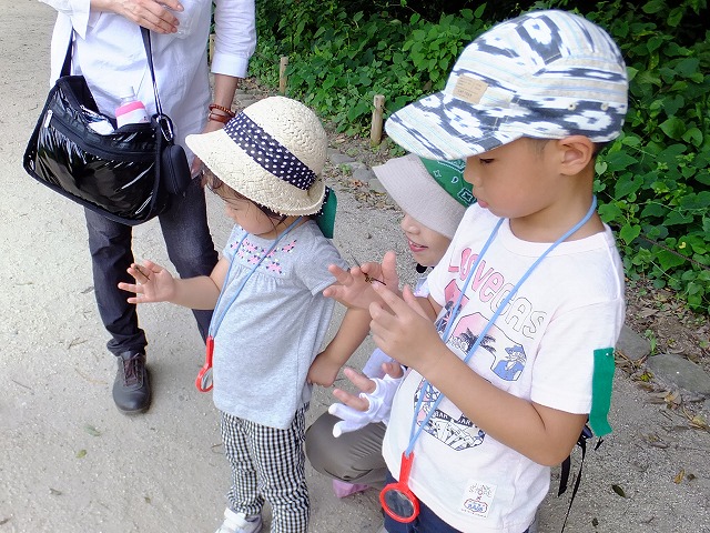 | 「夏休み自然発見!ドンちゃん・グリちゃんの自然展2015」と共催で開催しました。 今年一番の猛暑、広場の橋の下に集合し、4班に分かれて出発。バッタ・チョウ・セミ・ トンボなどを捕獲して、指導員からのお話し。虫たちの顔や体、オス・メス、食べ物など、虫の生活が分かったかな~? ファーブルポイントでは、捕ってきた虫を皆で見て、顕微鏡で観察、カブトムシを触って、本で調べて、楽しい観察会でした。 | |