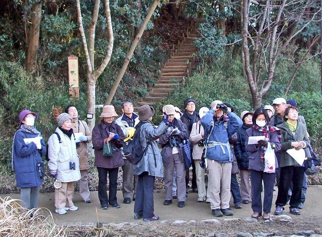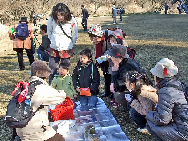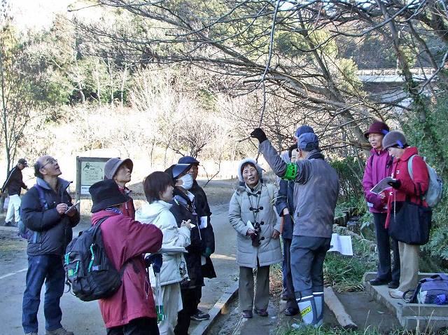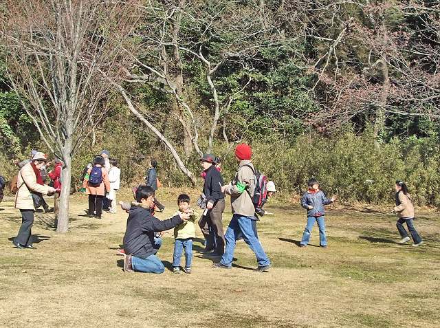 | 暖房も、暖かいコートもない自然の世界… 冬のあいだ"生きものたち"はどう過ごしているのでしょう? 厳しい季節を生き抜く生命の巧みな知恵や営みを観察しました。身近な公園にも、たくさんの不思議や発見が… 冬ならではの自然の見所を自然観察指導員がご案内しました。植物は冬季のタネの様子やタネの仕組み・ロゼット・冬芽などの観察。生きものはクモの卵のう・ミノムシなどの観察。鳥の観察は望遠鏡でサギ類・カモ類・オオハクチョウを観て感激し、鳥の巣を観て、スズメのクイズもやりました。最後に手づくりの種を飛ばす遊びを楽しんでもらいました。参加の皆さんには子どもの目線で自然を感じていただけたと思います。 | |