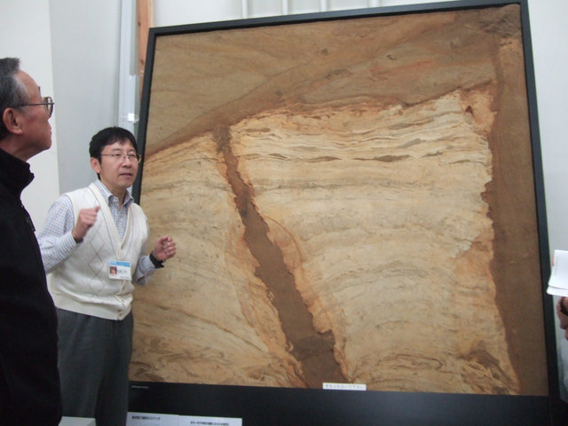 ![]() 01 地層の剥ぎとり標本。約10~20万年前の地層に見られる液状化による噴砂現象。 |
