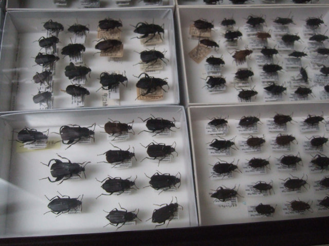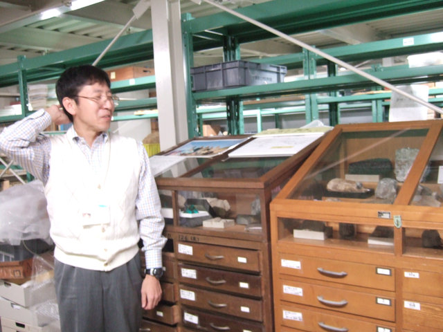 | 普段はなかなか見ることのできない中央博物館の1階部分にある収蔵庫。見学できる人数に限りがあり今回は抽選になりました。30名が2グループに別れ、それぞれ地学と動物の収蔵庫に入りました。地学の収蔵庫は加藤久佳氏、動物(昆虫)の収蔵庫は斉藤明子氏の案内です。それぞれに採集した標本や資料を動かぬ事実として100年200年…と未来につなげていくための調査研究・整理・保存・収納の仕方を説明してくれました。千葉県はもとより、国際的な立場に立った収集物も数多くありました。開発や時代の進展の中で、貴重な資料を収集し整理、保存していくという専門性の高い研究の一端に触れることができました。この後、10名は植物の収納庫に残り、40名は原氏、大野氏の案内で生態園をめぐりました。 | |