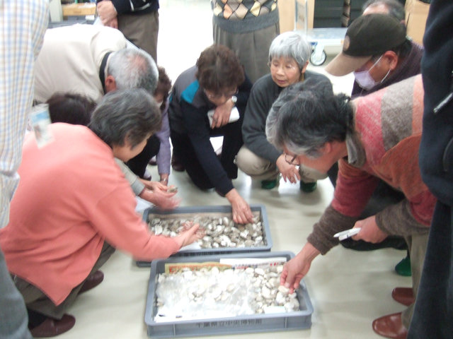 ![]() 03 8000年前の幕張の海の化石、貝化石やカニ化石を含むノジュールを手に取ってみる。 |