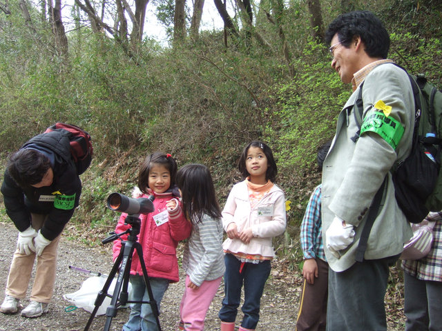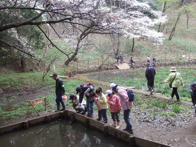 | 気温が低い(10~12℃)中での観察会になりました。しかし、昭和の森公園はちょうど桜が満開!! カタクリ咲く斜面にもソメイヨシノ、オオシマザクラ(系)、ヤマザクラ、そして、ウワミズザクラと桜のそろい踏み。一斉に噴き出した木々の芽出しの色が山笑うがごとく。指導員協議会による特別観察会カタクリガイドも行われています。そんな中で、子どもたちの瞳がきらきらと光ります。木の皮の下でうごめく虫を見つけたり、スミレやタンポポの花を愛でたり、アマガエルを捕まえたり… 冬には見られなかった植物や生きものが元気に春を感じて活動を始めていました。新学期開始前日の観察会だったためか、参加者が少なかったので、観察会の実施時期については、今後の検討課題となりました。 | |