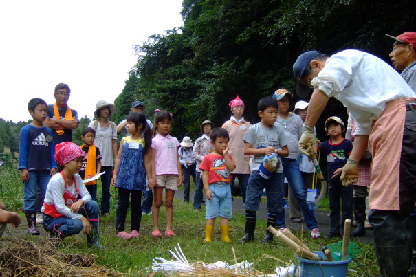 ![]() 02 田んぼの先生西川さんのお話。「鎌はよく切れるから気をつけてね。」 |