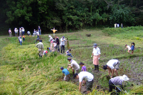 | 集合場所から蛍田んぼまで移動。道々、イナゴが、バッタが、トンボが、子ガニを抱えたサワガ二が… 子どもたちの足を止める。ようやく田んぼに到着。ビオトープの会の西川さんから鎌を使っての稲の刈り方、稲の束ね方などを教わって、田んぼへ。子どもたちは鎌を持って最初恐る恐る、お父さんやお母さんや指導員に助けられて、だんだん大胆に、最後にはもう一人でどんどん。螢田にザクッ、ザクッという小気味よい音と子どもたちの笑顔がはじける。稲が刈られ、行き場を失ったカマキリたちが田んぼをうろうろ。大人も子どもも泥にまみれ、稲刈りを楽しむ。刈られた稲は、おだに架けられ、昭和の森蛍田んぼに懐かしい谷津田の景色が広がりました。 | |