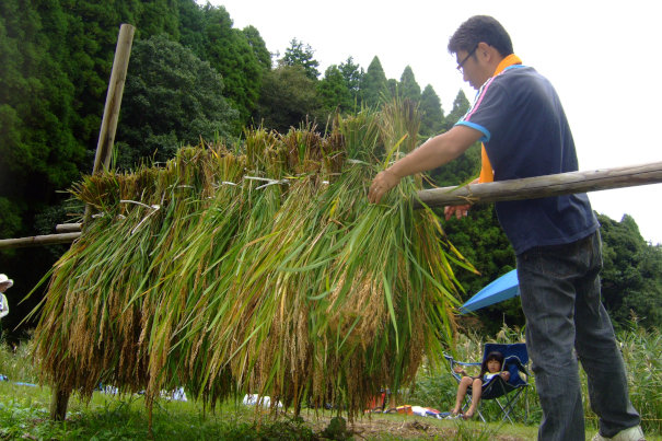 ![]() 08 お父さんは束ねた稲を運んで、おだに架ける。 |