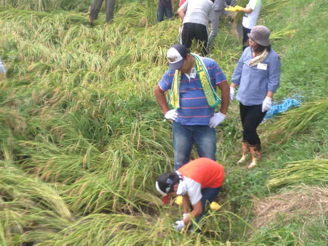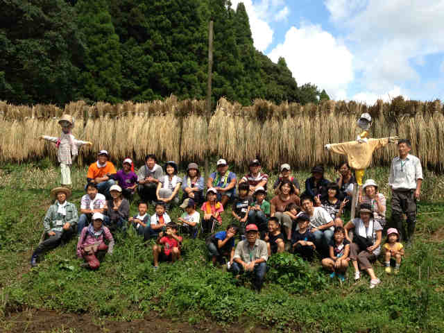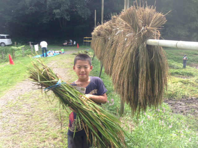 | 台風18号が関東地方に接近しているという不安な天候でしたが、当日は晴れのお天気に恵まれて、秋晴れの下での「稲刈り」となりました。5月に田植えをした10家族全員が参加してくださいました。自分たちが植えた稲がすっかり稲穂を膨らませ、大きく実ったお米を見て、歓喜の声がながれていました。 | |