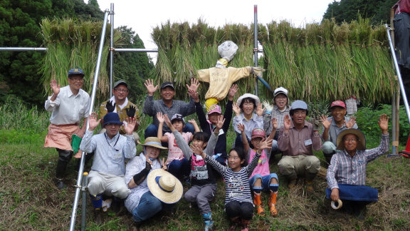 ![]() 09 子ども田んぼの稲刈り終了。「やったね」 おだの前で記念撮影をしました。 |