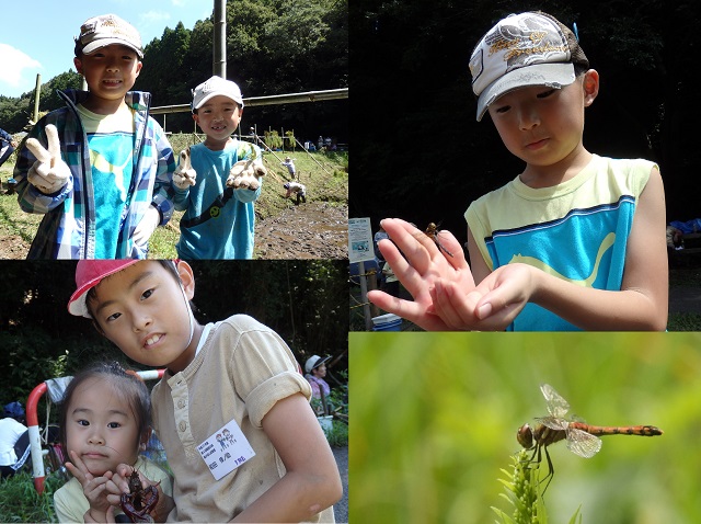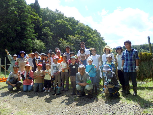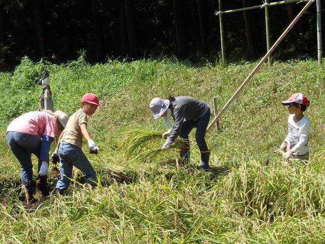 快晴の中、親子田んぼ教室稲刈りを行いました。田んぼは前々日の雨でぬかるみ、足を運ぶのもやっとという状態でしたが、皆さんはりきって親子の連携で稲刈りを終え、おだに稲を掛けました。 稲刈り後は、アカトンボやメダカ、チョウセンカマキリ、イナゴなどたくさんの田んぼの生き物観察を楽しみました。 |