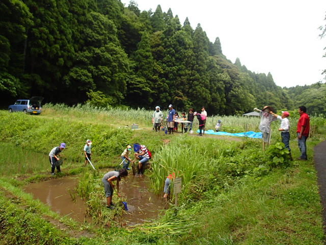 | 梅雨本番で、早朝の雨と強風で実施が危ぶまれましたが、開始時間には雨がやみ、蛍田では心地よい風が吹いていました。4月30日に植えた稲は、元気よく成長していました。今回は、おいしいお米がたくさん実るように田んぼの雑草取りを頑張りました(^▽^)/ | |