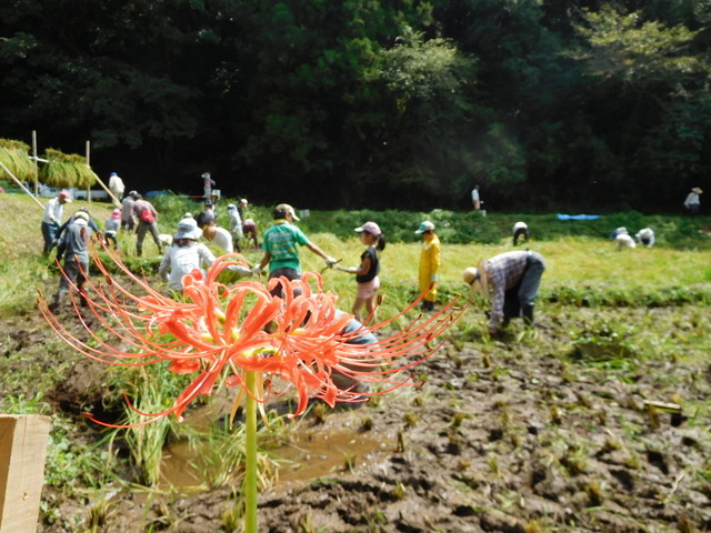 | 秋雨前線や台風の影響で実施が危ぶまれた稲刈日でしたが、当日は雨も降らず、9家族の参加がありました。ぬかるんだ田んぼで、最初はおっかなびっくりで稲刈りをしていた参加者たちでしたが、刈り進むにつれてコツをつかみ、サクサクとリズムよく、楽しく稲刈りができました。 | |
