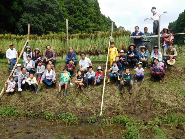 ![]() 08 稲刈り終了後、案山子と はざかけをバックに記念写真。稲刈りは最高に楽しかったよ |