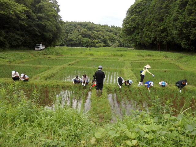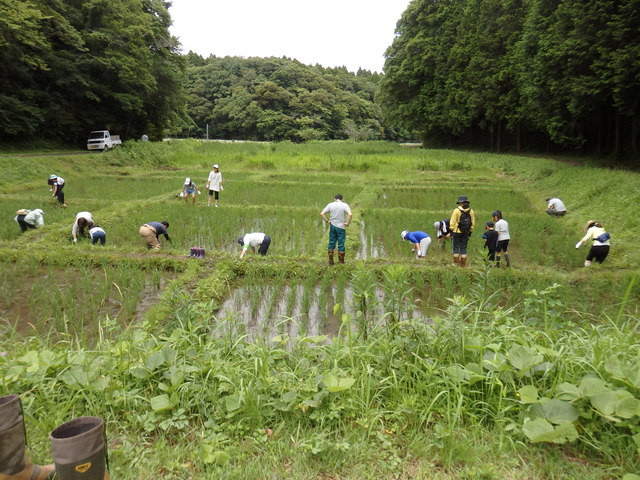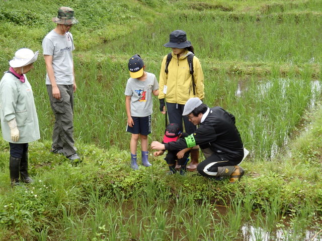 | 生憎の曇天でしたが、田んぼの草取りに5家族が参加しました。4月に植えた稲は2カ月弱で2倍以上の高さ、株数も増えていました。稲の間にはニホンアカガエル子ガエル、メダカやアメンボなどがたくさん泳いでいました。 | |