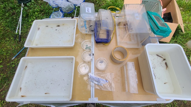 ビオトープ池や水路で生き物調べ。大きなニホンアカガエル、シオカラトンボ、 |