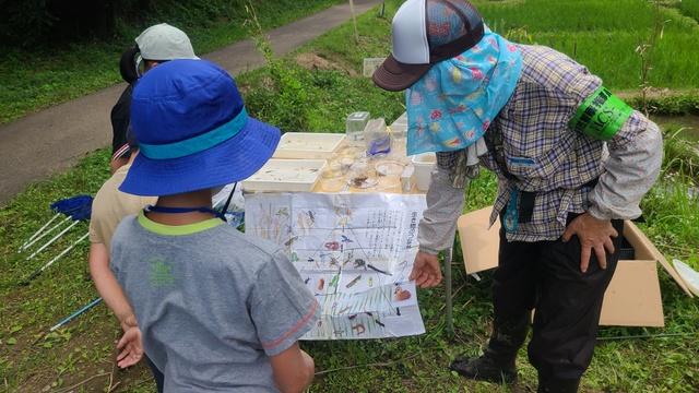 梅雨の晴れ間、親子田んぼ教室草取りが実施された。田植えをしてから2カ月、参加者は、稲の成長を 確認し、稲の養分を横取りする雑草取りを頑張りました。田んぼの雑草を取り終えた後は、生き物調べのため田んぼの生き物を捕まえ、生き物つながりシートに置き、食べる食べられるの関係を実感しました。 最後に、捕まえた生き物をもといたところに帰してあげました。 |