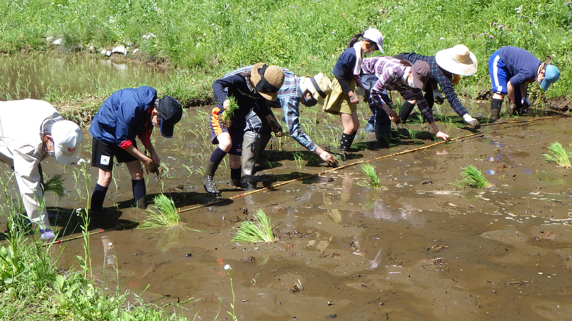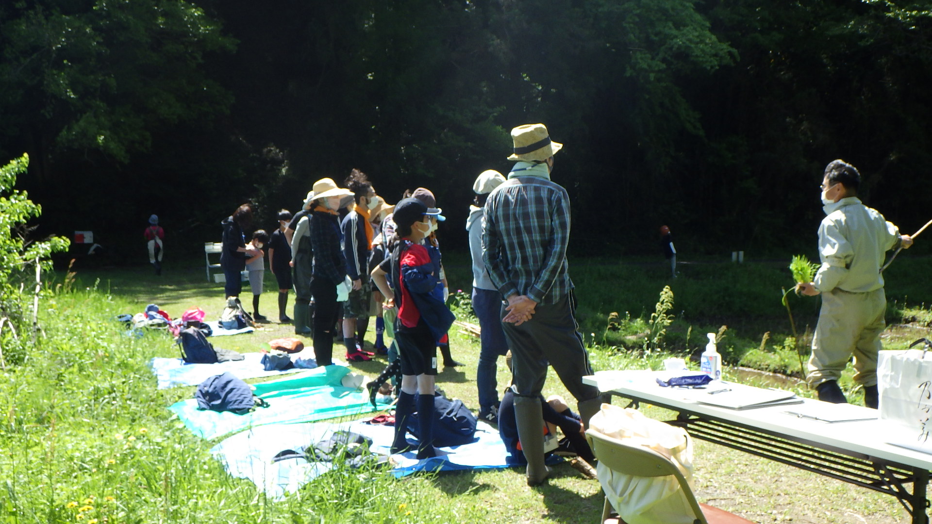 前日の雨が上がり、朝からお日様キラキラ。草木の緑輝く昭和の森ビオトープ田んぼ(蛍田)で恒例の親子田んぼ教室が開催されました。コロナ禍のため、今年も人数を大幅に絞って、マスクを着用しての実施となりました。参加した親子はオタマジャクシがゴロゴロ生息している田んぼでの田植え体験に感動。 どろどろの田んぼや生き物探しを楽しんでいました。 |