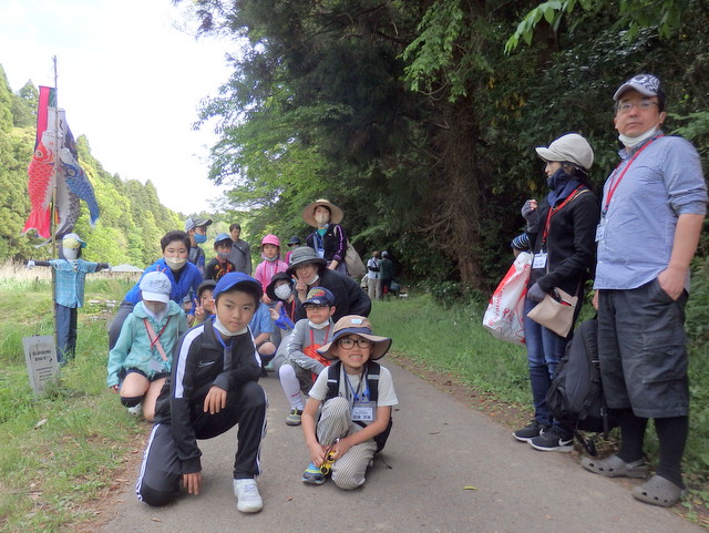 01 出迎えてくれた鯉のぼり、案山子と一緒に記念撮影。みんなで「田植え頑張ろうー」 |