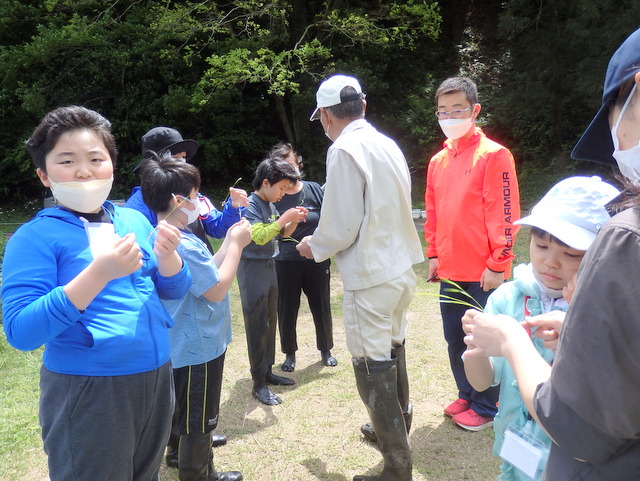 新緑の昭和の森ビオトープで親子田んぼ教室「田植え」が開催された。田んぼに到着すると、案山子と 鯉のぼりのお出迎えで、参加者は大喜び。シュレーゲルアマガエルや小鳥の鳴声のBGM、柔らかな泥の感触を楽しみながらの田植えは格別でした。田植えの後は生き物調べを行い、いろいろな生き物が田んぼで稲と共に生まれて育っていることを実感しました。 |