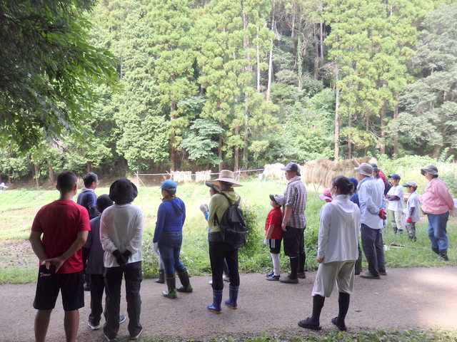 | 今年の親子田んぼ教室稲刈は、例年にない暑さの中で実施されました。田んぼは、一週間前の台風の大雨で土砂が流れ込み、足を運ぶのも大変な「ふかんぼ」。それでも、参加者は泥だらけになりながら生き物と触れ合い、稲刈り、はざかけ作業を楽しみました。 | |