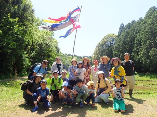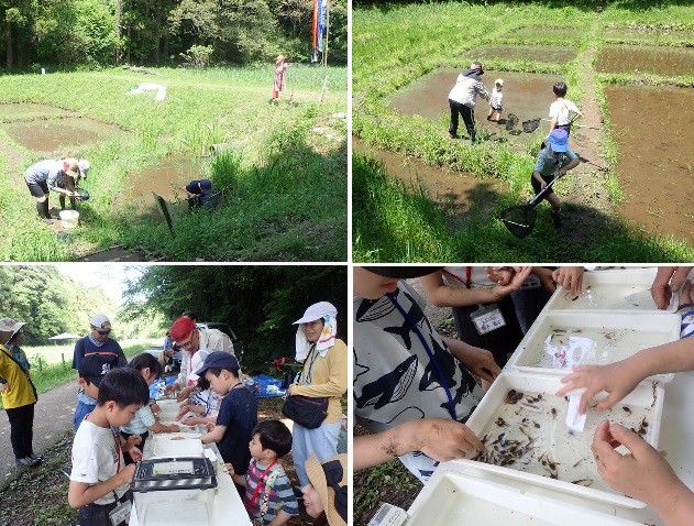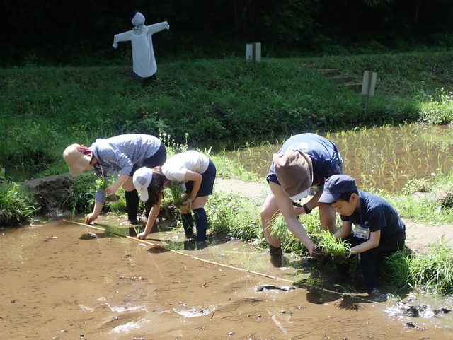| 新緑の昭和の森ビオトープで親子田んぼ教室「田植え」が開催された。田んぼに到着すると、案山子と鯉のぼりのお出迎えで参加者は大喜び。シュレーゲルアマガエルや小鳥のBGM、柔らかな泥の感触を感じながらの田植えは格別でした。田植えの後は生き物調べをし、たくさんの生き物が田んぼで稲と共に育っていることがわかりました。 | |