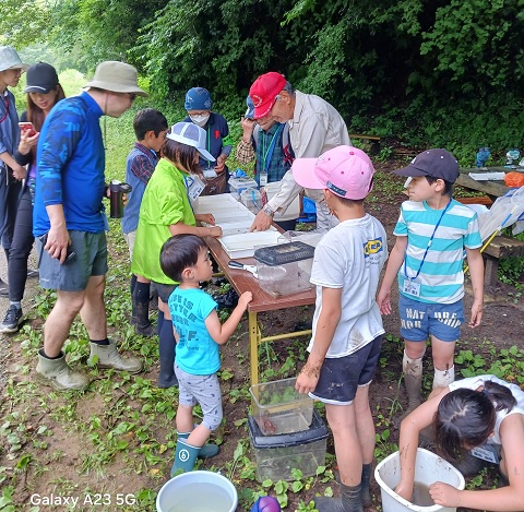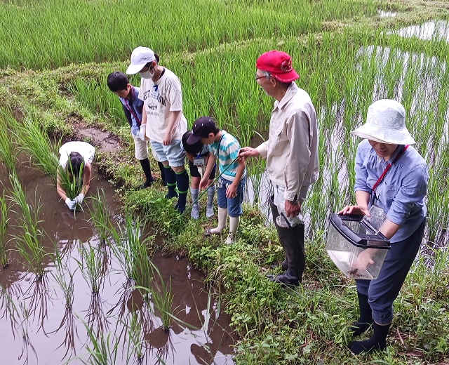| 朝方までの雨で空模様を気にしながらのスタートになりましたが、雨後の昭和の森はすがすがしく、たくさんの生き物とたわむれながら、稲の成長を親子で確かめ合いました。田んぼの雑草は少な目に見えたけれど、取ってみるといろいろな種類があることがわかり、改めて、草取りの大切さを知ることができました。子どもたちの大好きな生き物調査。蛍田に歓声と笑顔がはじけます。無農薬、無肥料、一年中水張り田んぼでの貴重な体験に、大満足・感謝の感想が寄せられました。 | |