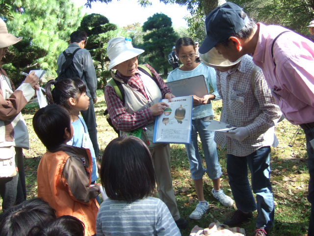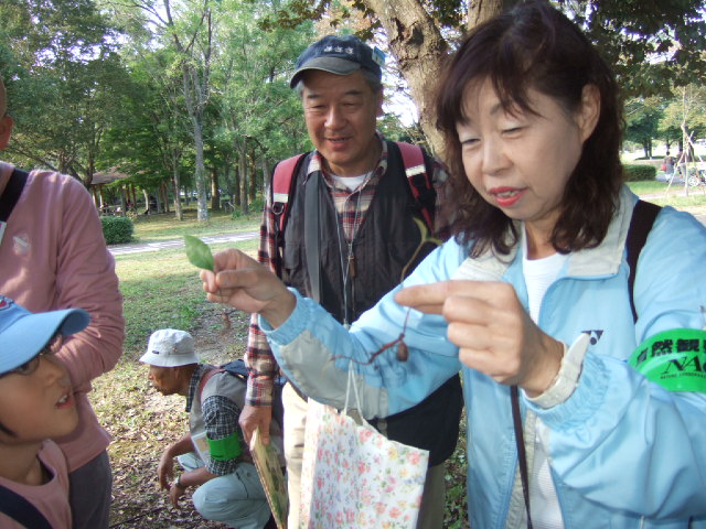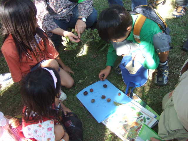 | 昭和の森には、8種類のどんぐりの木があります。コナラ、クヌギ、アラカシ、シラカシ、カシワ、スダジイ、マテバシイ、クリです。台風18号が8日に通過したため、昭和の森にはたくさんのどんぐりや木の枝や葉が落ちていました。今回のコースでは、クリ以外の7種類のどんぐりと出会うことができました。 参加者の感想:①普段来ている森だが、木や生き物が多いのに驚いた。②いろんな種類のどんぐりの木が楽しかった。③同じどんぐりでも、色、形が違い面白かった。④どんぐりの中のムシがかわいくなった。⑤子供達がムシを怖がらなかったのにびっくりした。⑥生で食べられるどんぐりがあって面白かった。 。 | |