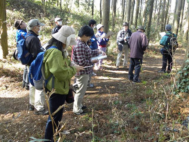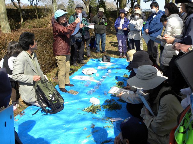 | 3月中頃と言え一寸肌寒い日です。2月中止で1ヶ月ぶりの観察会です。テーマが分かり辛く参加者の数が気になりましたが、心配することはありませんでした。「蓄えが3年無い国は国ではない」という問い掛けから始まった観察会です。続いて、飢餓に備えての野草の観察です。ハコベ、タンポポ、ノビルなど、参加者がこんなに昭和の森には沢山食べられる野草があると関心し、観察会の楽しさを肌で感じた様子です。生活物資の1つ材木。現在は花粉症で迷惑がられる杉。当時は柱や、薪や線香に用途が多く、諸藩で育てられました。生活に役立つものは自分たちでと言うことで、桑や樫、椚が植えられました。大切な森を守る工夫もずいぶん考えられていたようです。何十年か前襟裳岬の昆布料ジリ貧だったものを、森を再生させて海を生きかえらせ、話題になりましたが、すでに江戸の時代から考えられていた様子の説明も感動ものです。 | |