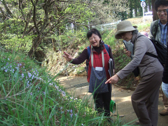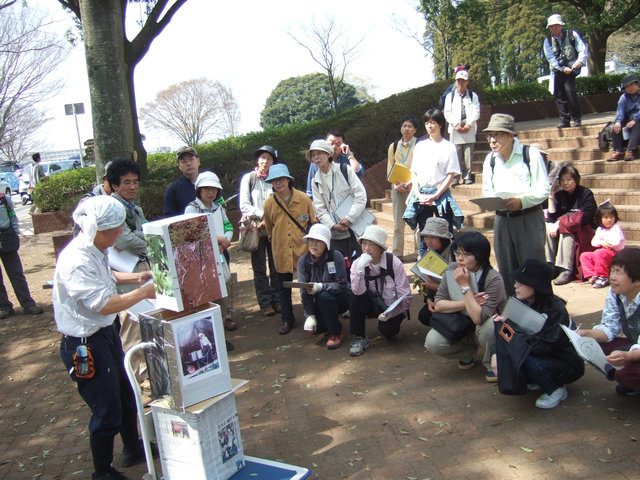 | 久しぶりのポカポカ陽気。太陽が明るく園内を照らし、心弾む春です。観察会は担当指導員扮する作業員のおじさんが一輪車をひいて登場し、カタクリ移植の歴史を小道具や大きな写真を使って熱演するところから始まりました。それは平成9年、昭和の森の一部に雨水調整池(3号)設置に発し、指導員協議会が昭和の森の自然保護のためにこの問題に取り組んだ歴史でもあります。その後、新設される3号調整池への観察コースに特別に入れてもらい、その状況を確認しました。移植した植物は8年目、あたらしい土地にも慣れ、広がり、雑木林の斜面林を飾っています。カタクリは花の時が終わり、ほとんどが実をつけていました。園内はサクラ、スミレ、キブシ、クロモジ、モミジなどの花々が咲きほころび、参加者は「木にも花があったのですね」「カタクリがいとおしくなりました」… と発見を喜んでいました。 | |