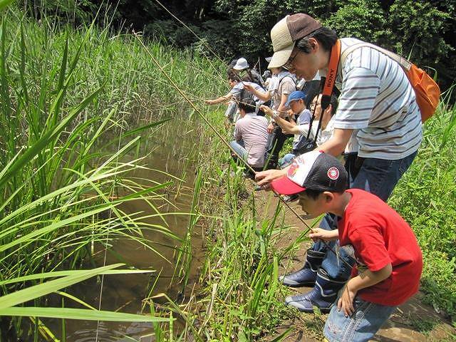 | 幸いにも天候に恵まれ、池に川に幼子から大人までの歓喜の声が木霊しました。今回の活動のメインは、昭和の森菖蒲田の調整池でのアメリカザリガニ退治と小中川上流での生きもの調べです。昭和の森から小中川までは往復一時間の道のりがあります。どちらの活動に参加するかは選択性にしました。 昭和の森のザリガニは外来種のアメリカザリガニでホタルなどの生育に害を及ぼします。今年菖蒲田では200匹余りのゲンジボタルが飛翔しました(6/12夜確認)。花菖蒲が谷を白やピンクや紫に染めています。ザリガニ池にはウシガエルの大きなオタマジャクシやメダカが、近くの湧き水の流れにはカワニナが大小どっさり。釣り糸には次々とザリガニがかかり、みな興奮しまくり。釣果は一人平均7匹ぐらいになりました。 小中川では流れの中に入って、サワガニやカワニナ、ヘビトンボなどの指標生物を捕まえました。大人も子どもも、もう夢中でした。小中川は生き物調べの結果から判定すると、きれいな水と少し汚い水に入るようです。 | |
