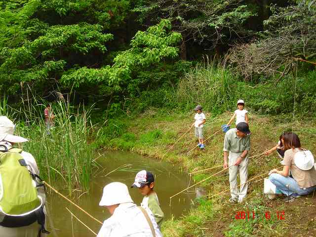 | 梅雨の晴れ間で天候にも恵まれ、大人も小人も一緒になって楽しんだ観察会でした。今回は、小中川上流での生き物調べのグループと昭和の森菖蒲田調整池でのザリガニ退治のグループの二手に分かれて実施しました。小中川では川に入り、数え切れないほどの沢山の生き物に出会いました。カエル・ヤゴ・サワガニ・ヨシノボリ・ドジョウ・・・そして、菖蒲田調整池ではさきいかを付けた釣り竿で、これまた数え切れないほどのザリガニを補獲することができました。 | |