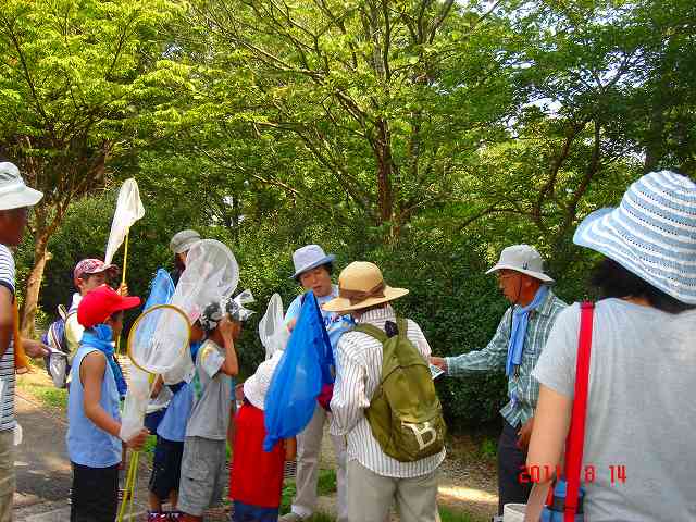 | 連日の猛暑とお盆休みということで参加者も少ないのでは・・・という心配もよそに、 たくさんの親子連れが参加してくれました。昭和の森には、オニヤンマだけではなく 色々な種類のトンボが飛んでいます。指導員からトンボの名前や特徴などを教えてもらいながら、菖蒲田に降りていくと・・・本日の主人公「オニヤンマ」の姿を発見!! さすが羽の大きさや顔・・・左右の眼・あごの迫力に参加者全員、圧倒させられました。 | |