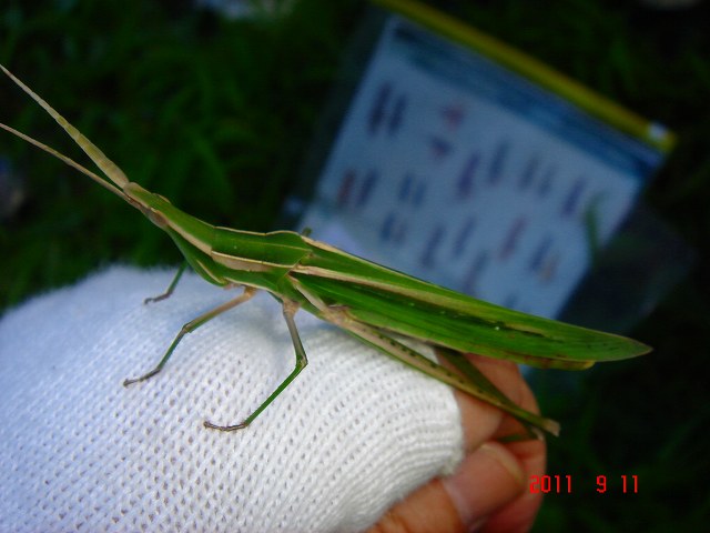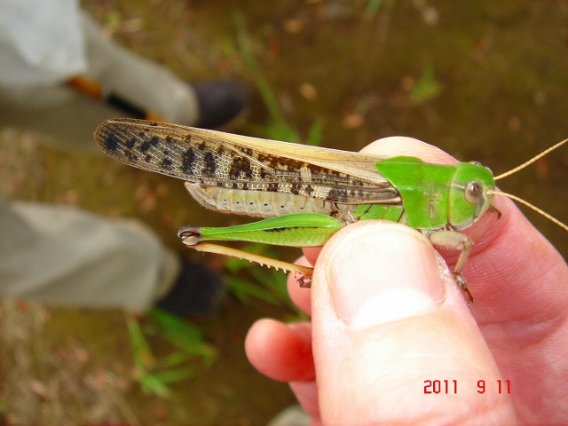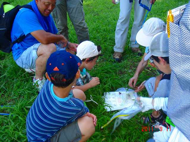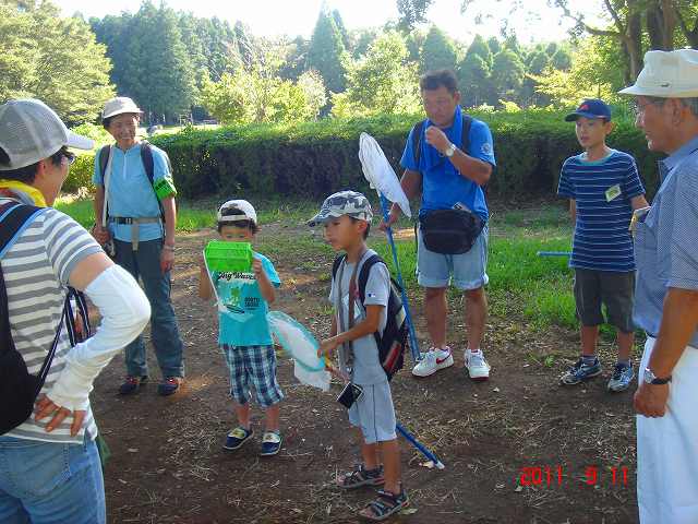 | 9月とはいえ、まだまだ厳しい残暑のなかでの観察会となりました。先月の「オニヤンマ」に続いて「トノサマバッタ」と、今月も子ども達に人気の「虫」の観察会です。参加者は大人も子ども捕虫網を片手に、夢中になってバッタを捕まえていました。指導員から バッタ・コオロギ・キリギリスの見分け方等を教えてもらいました。昭和の森にはたくさんのバッタやイナゴの仲間がいますが、それぞれの特徴や名前等を勉強しました。 | |