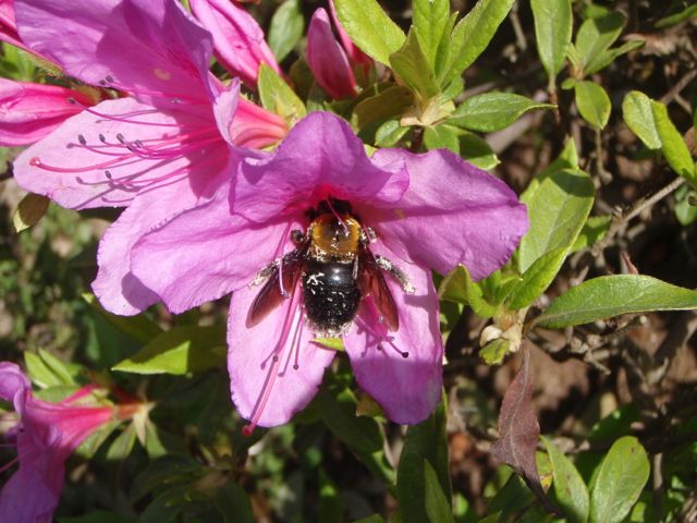 ![]() 04 ツツジの花には様々な昆虫がやってくる。花粉まみれのクマバチも。 |