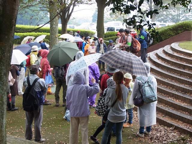 | 生憎の小雨でも50人近く参加者が集まる人気のキノコ。普段は昼から行っている観察会ですが、今回は午前にキノコ採取、午後は吹春俊光先生による解説という1日コースで昭和の森のキノコをじっくりと楽しみました。 | |