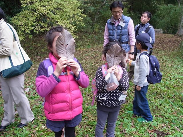 ![]() 02 ホオノキの葉でお面を作りました。顔が隠れるこの大きさ。 |