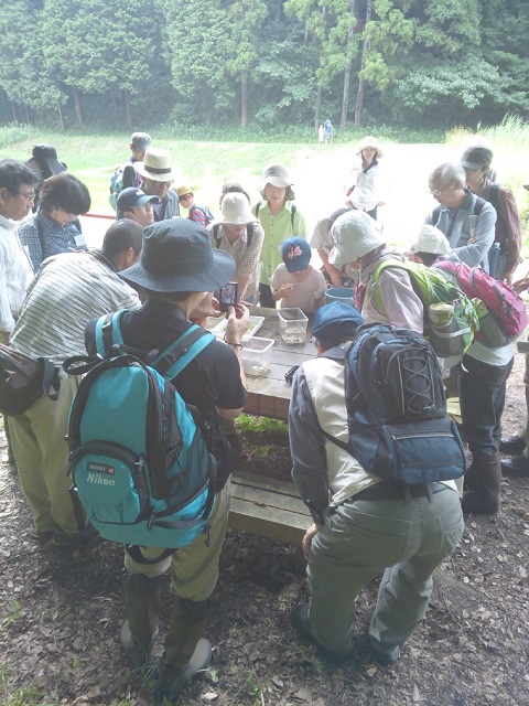昭和の森では湧水からのきれいな水が絶えず流れており、蛍田周辺ではメダカやホトケ ドジョウなどがいるが、下夕田池では特定外来生物のウシガエルやブラックバス、アメリカ ザリガニやミシシッピアカミミガメがたくさん生息し、メダカやヤゴなどを食べていることなどを話しました。 |
