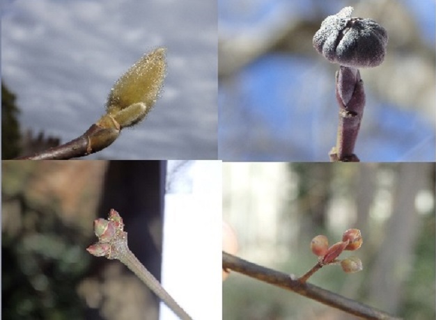 ![]() 04 冬芽は色々な形をしています。上の左からハクモクレン、ハナミズキ、マユミ、クロモジ |