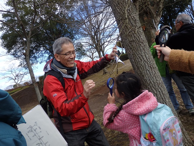 | 日陰に入ると冷たい風が吹き抜ける空模様でしたが、元気な親子づれの方たちが集まりました。太陽があたる場所では、ナナホシテントウやカントウタンポポ等が観られ、参加者たちは、もうすぐ訪れる木々の個性ある春の準備の観察を楽しみました。 | |