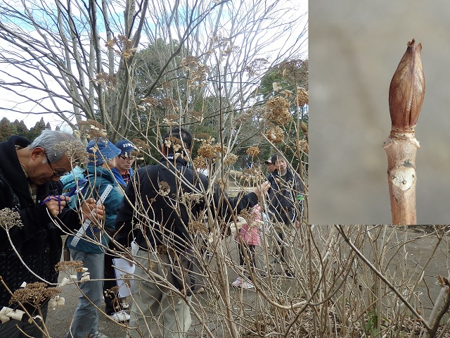 アジサイで頂芽、花芽、葉痕、芽麟痕などを観察。 |