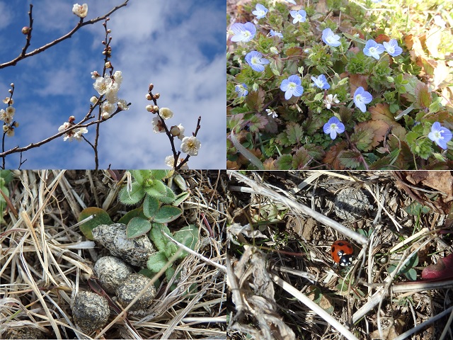 梅林では、梅の香りが漂い、オオイヌノフグリなどの花や |