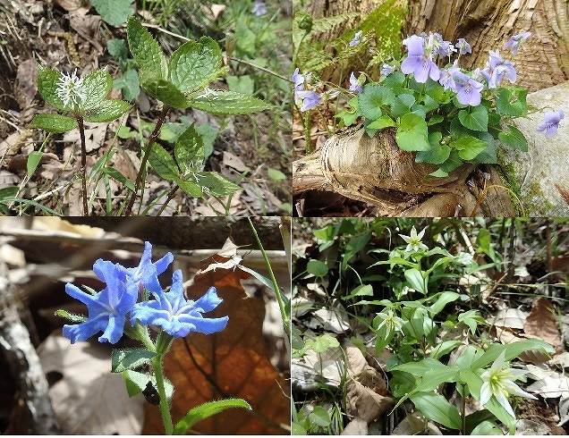 ![]() 04 左上から、ヒトリシズカ、タチツボスミレ、ホタルカズラ、チゴユリ |