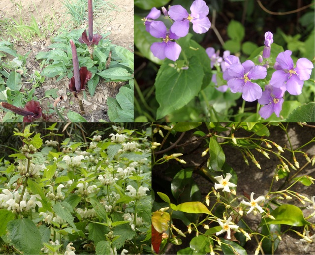 左上から、コンニャクの花、ショカツサイ、オドリコソウ、テイカカズラなど |