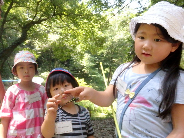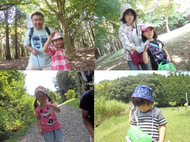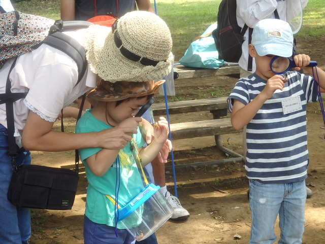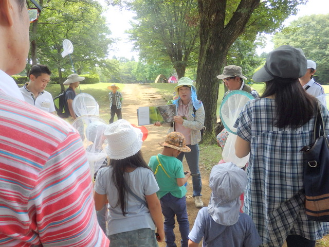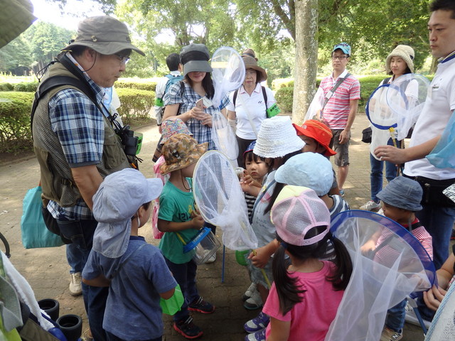 | 夏真っ盛り、セミの大合唱の中、たくさんの親子の皆さんたちが捕虫網をもって集まりました。参加者の皆さんは、トンボやセミの生態を聴き、実際に捕まえてよーく観察し、トンボやセミの棲み処-自然へ放しました。この観察会でトンボやセミと仲良くなったようですね。 | |