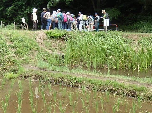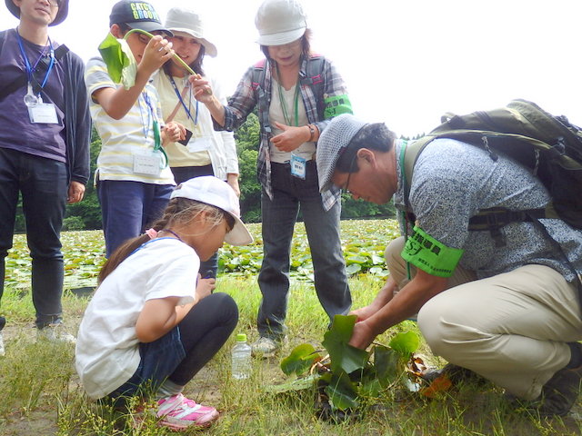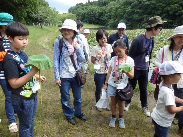 梅雨に入っての観察会でしたが、爽やかなお天気でした。今回は普段は水の中のため見る ことができない水辺に生える植物の葉や茎、根などをルーペでしっかりと観察しました。 参加者は、水生植物の水辺を利用して育つひみつを見つけ、水辺で生きる植物の知恵に感心していました。 |