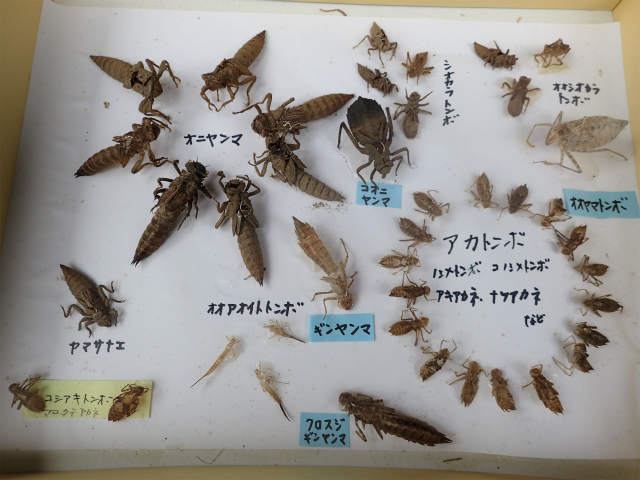 指導員がいろいろなところで集めたトンボのヤゴの脱皮殻です。 |