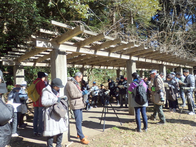 ![]() 10 藤棚の下で今日観られた野鳥をみんなで確認、27種類もの野鳥を皆で観ました。 |