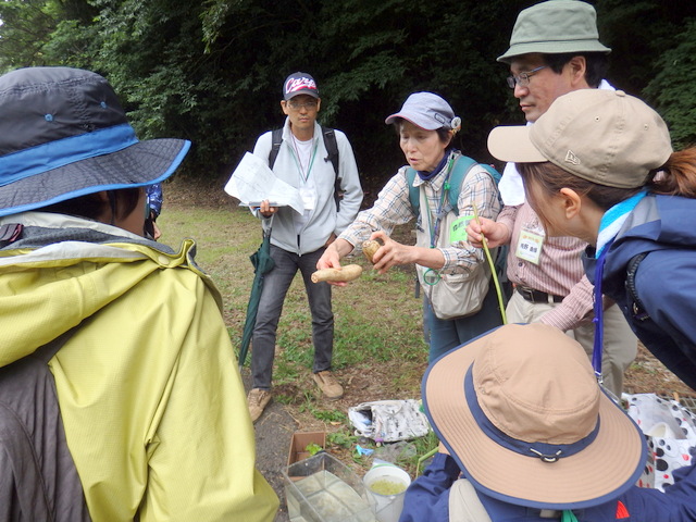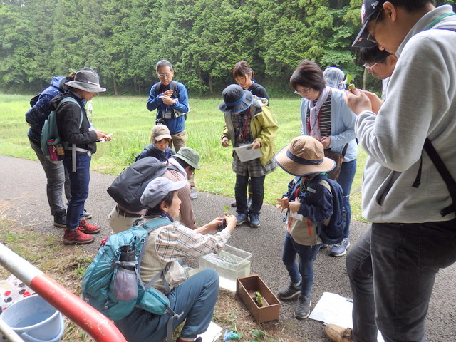 6月定例観察会は、普段水の中に生えていて観ることのできない水辺の植物のひみつを 探りました。根や茎、葉っぱなどを輪切りにしたり、浮かしてみたりなどして浮く仕組みを観察しました。参加者は、水辺に生きる植物の生きる工夫に驚いたり、感心したりでした。 |
