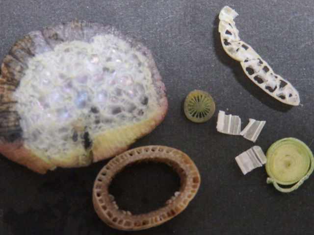 水辺の植物の茎や地下茎、葉っぱを輪切りにしたら、たくさんの穴が開いていて、 |